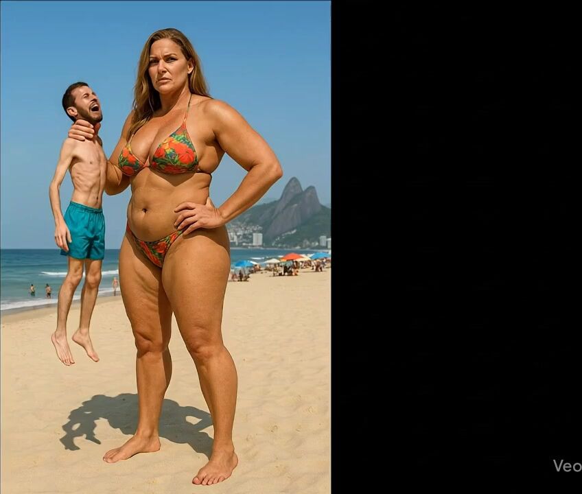 tall woman dominant small man lifd him and carry